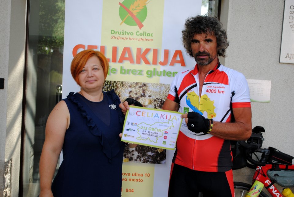 Novomeški rekreativni kolesar Matjaž Golob v teh dneh križari po Sloveniji, njegov namen pa je osveščanje o celiakiji in težavah, s katerimi se bolniki s to boleznijo soočajo v vsakdanjem življenju. Obiskal bo vseh 212 občin v Sloveniji, danes se je zaustavil tudi v Ajdovščini. Pred občinsko stavbo ga je sprejela direktorica občinske uprave Mojca Remškar Planinc.
