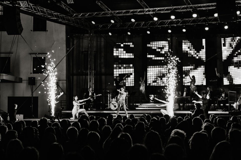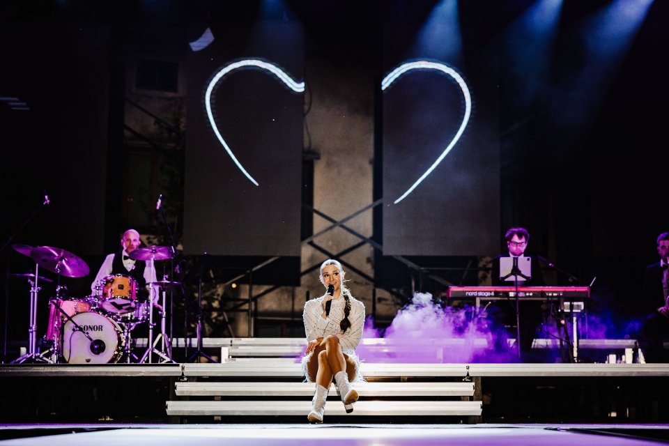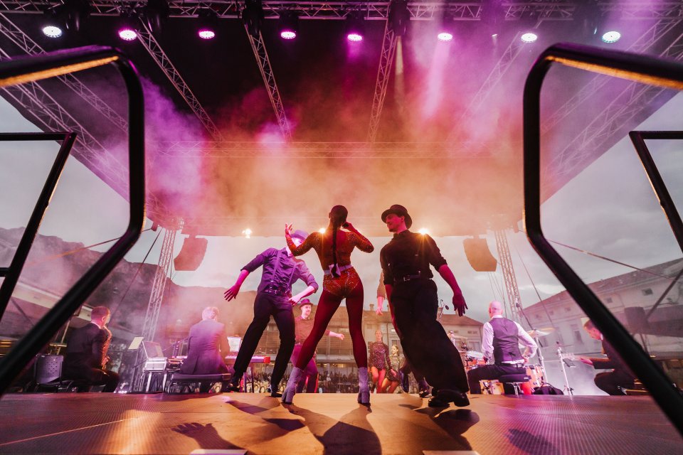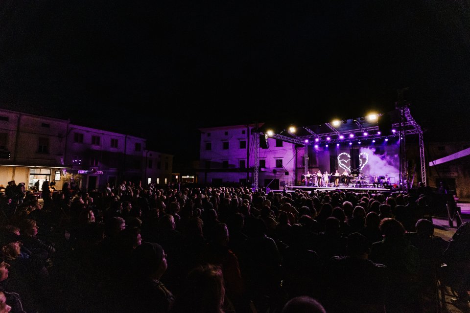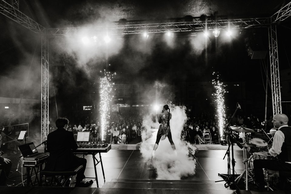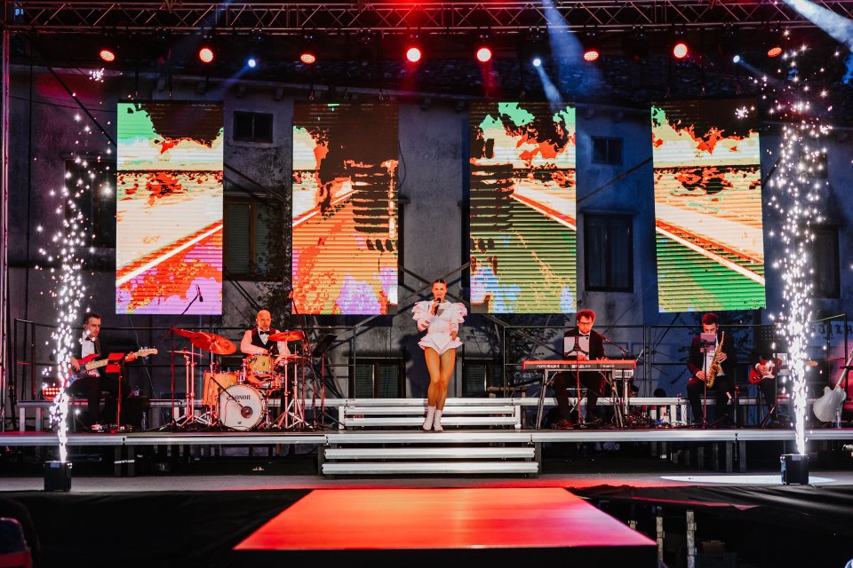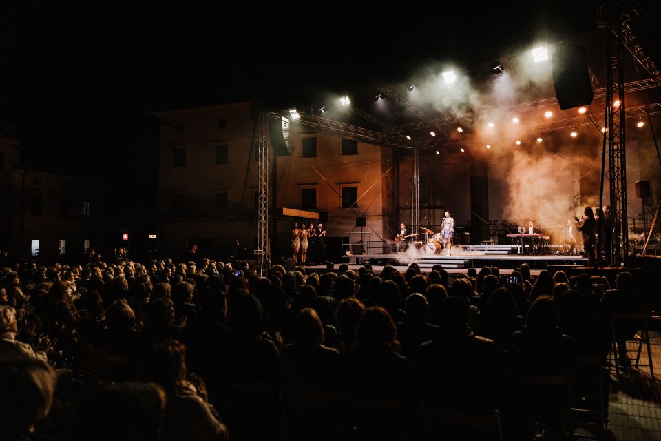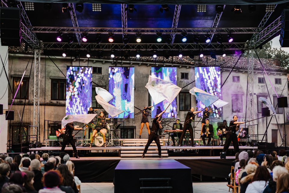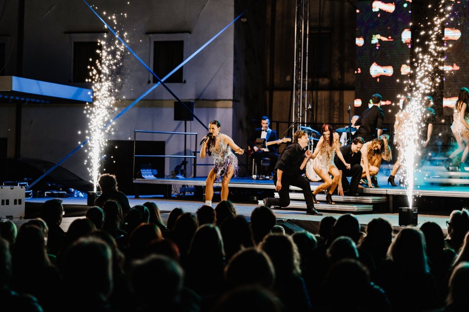 Na odru, preurejenem v pravo kabaretno gledališče, so poleg Tjaše Fajdiga nastopili še plesalci iz plesnega studia Mihe Krušiča, ki so s koreografijami Mihe Krušiča in Erika Bukovnika dodali dinamičnost in eleganco. Glasbeno spremljavo je v živo izvajala zasedba pod vodstvom Anžeta Vrabca, kar je dodatno obogatilo večer. Predstava Ona je bila poklon Ajdovščini, saj je skozi glasbo in ples pripovedovala zgodbo mesta, njegovih ljudi in duha. Občinstvo je bilo navdušeno nad energijo in profesionalnostjo vseh nastopajočih, kar je ustvarilo posebno vzdušje na trgu.