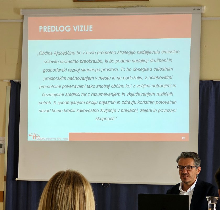 »Občina Ajdovščina bo z novo prometno strategijo nadaljevala smiselno celovito prometno preobrazbo, ki bo podprla nadaljnji družbeni in gospodarski razvoj skupnega prostora. To bo dosegla s celostnim prostorskim načrtovanjem v mestu in na podeželju, z učinkovitimi prometnimi povezavami tako znotraj občine kot z večjimi notranjimi in čezmejnimi središči ter z razumevanjem in vključevanjem različnih potreb. S spodbujanjem okolju prijaznih in zdravju koristnih potovalnih navad bomo krepili kakovostno življenje v privlačni, zeleni in povezani skupnosti.«
