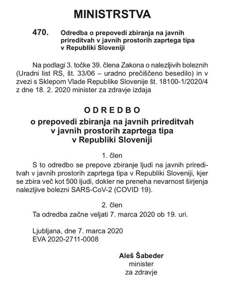Ministrstvo za zdravje je danes ob 19. uri objavilo Odredbo o prepovedi zbiranja na javnih prireditvah v javnih prostorih zaprtega tipa v Republiki Sloveniji, z več kot 500 obiskovalci. Preventivno odpovedni tudi dve domači prireditvi.