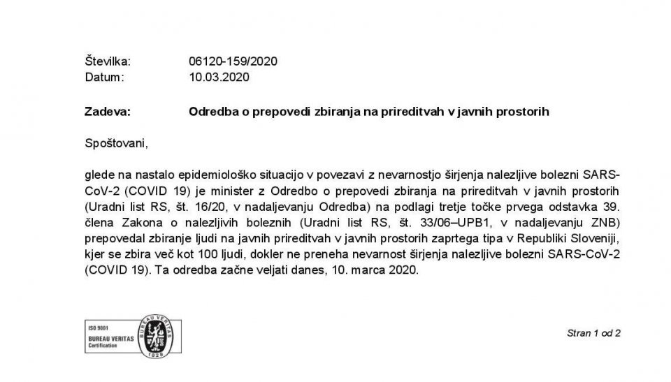 10. marca je pričela veljati odredba Ministrstva za zdravje, ki prepoveduje zbiranje v javnih prostorih za več kot 100 oseb. Odpovedi prireditev se vrstijo. Začasno iz previdnostnih razlogov počivajo tudi avtomobili projekt Sopotnika. V nadaljevanju objavljamo aktualne informacije o odpovedih in zaprtjih, ki jih bomo sproti osveževali.