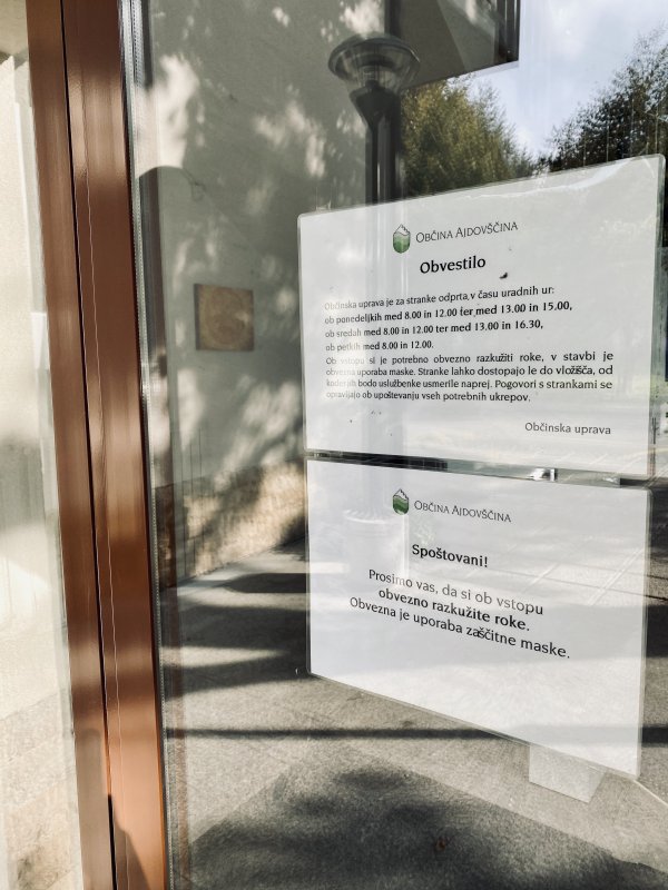 Občinska uprava Občine Ajdovščina zaenkrat deluje nemoteno, ob doslednem upoštevanju samozaščitnih ukrepov bo v tem tednu uvedeno tudi merjenje temperature ob vstopu v stavbo. Stranke lahko v stavbo vstopajo le v času uradnih ur in le do vložišča, od koder jih bosta uslužbenki napotili naprej. Vse stranke pa naprošamo, da se v čim večji meri poslužujete komunikacije na daljavo in urejate zadeve preko elektronske pošte ali telefona.