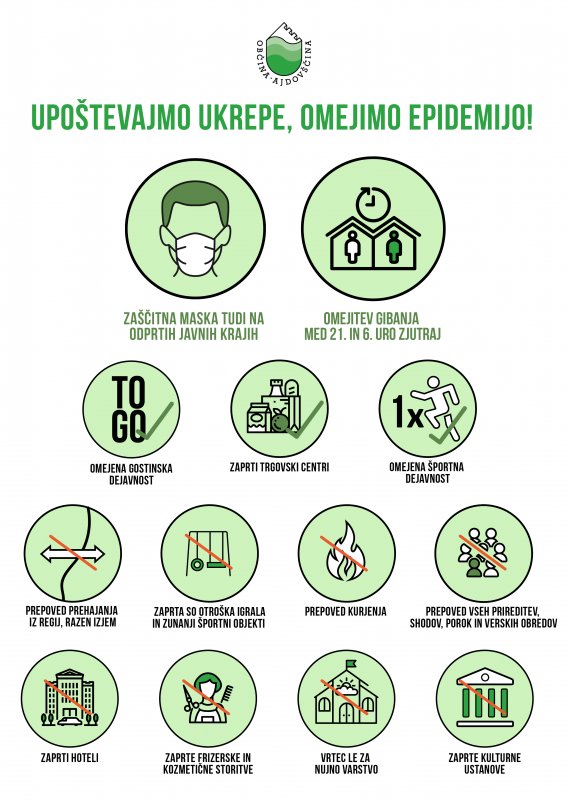 Zaradi vse slabšega epidemiološkega stanja je upoštevanje ukrepov in dosledno izvajanje samozaščitnih navodil nujno. Vse občanke in občanke pozivamo, da se ukrepov držijo, od doma pa odhajajo le po najnujnejše. Vikend, ki je pred nami, izkoristite za druženje v ožjem družinskem krogu in individualne aktivnosti v naravi.