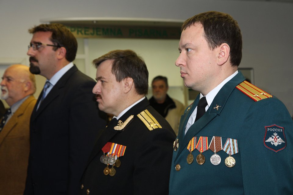 Božo Novak, župan Tadej Beočanin, vojaški ataše na ruskem veleposlaništvu Mihail Glagazin in njegov namestnik; foto Roman Žonta