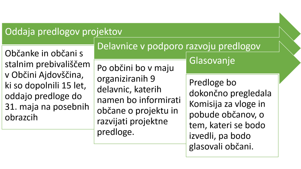 Cilj poziva je pridobiti projektne predloge na vsakem od 6 področjih občine (Ajdovščina - mesto, Gora, Vipavski griči, Dolina - vzhod, Dolina - center in Dolina - zahod), ki bodo v naslednji fazi podani na glasovanje občankam in občanom, starejšim od 15 let in s stalnim bivališčem na posameznem območju.