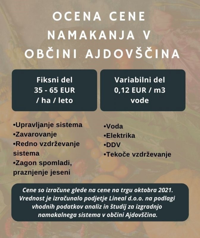Do konca pomladi je za vzpostavitev namakalnega sistema potrebno zbrati podpise pogodb za 67 % površin zemljišč, ki so potencialna za namakanje. V veliko pomoč pri tem ste nam lastniki in kmetje, ki ste že izrazili željo za vključitev svojih površin v namakalni sistem.