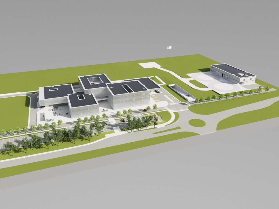 objekta. Lekarna in zdravstveni dom si delita prostore konferenčne dvorane s spremljajočimi prostori. Kuhinja z jedilnico je umeščena v drugem nadstropju objekta ob prostorih uprave zdravstvenega doma. Pod celotnim objektom lekarne in zdravstvenega doma je predvidena podzemna garaža, v kateri se zagotovi parkirna mesta ter različne servisne prostore (centralne garderobe, ekonomat, skladišče perila, hišnik …) in tehnične prostore (strojnica, elektro prostori, TK prostori ipd.). V podzemni garaži bo zagotovljenih 175 parkirnih mest namenjenih zaposlenim in obiskovalcem, dodatno bo v okolici objekta zagotovljenih približno 100 parkirnih mest.