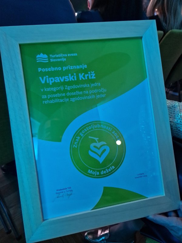 Turistična zveza Slovenije je nadgradila tradicionalni natečaj »Moja dežela – lepa in gostoljubna«, s katerim že več kot tri desetletja širi turistično prepoznavnost slovenskih krajev. Vseslovenski izbor se po novem imenuje Moja dežela – znak gostoljubnosti, s katerim smo se vrnili k koreninam slovenskega turizma. V kampanji, ki letos praznuje 40. obletnico, je šlo v osnovi za kultiviranje gostoljubnosti, pravzaprav za učenje Slovencev in Slovenk, kako biti prijazen do domačih in tujih obiskovalcev, kar je tudi rdeča nit prenovljenega izbora Moja dežela – znak gostoljubnosti 2024. V njej smo izbirali najbolj gostoljubne in turistično najbolj privlačne slovenske kraje, ki so jim sinoči v Laškem podelili zlate, srebrne, bronaste ter zelene znake gostoljubnosti. Med njimi je posebno titulo prejel tudi Vipavski Križ, in sicer v kategoriji zeleni znak gostoljubnosti v kategoriji zgodovinskih jeder za posebne dosežke na področju rehabilitacije zgodovinskih jeder.