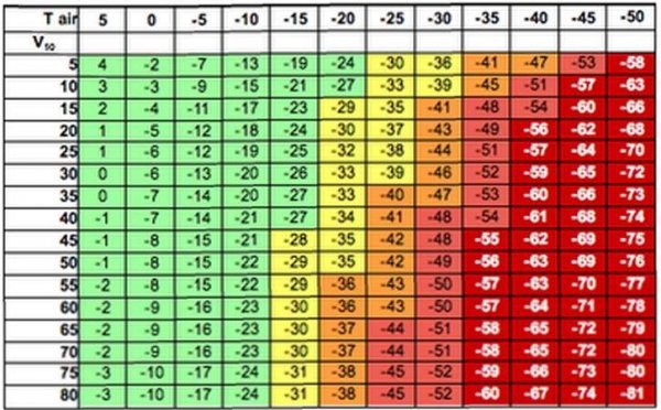 Barvna polja označujejo stopnjo tveganja za ozebline (za večino ljudi):