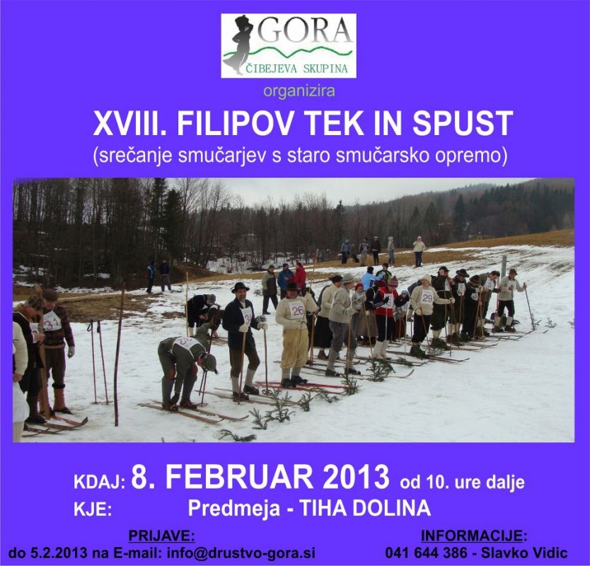 Društvo za ohranjanje in varovanje naravne in kulturne dediščine Gora prireja XVIII. Filipov tek in spust, v počastitev 117. obletnice prve smučarske tekme, ki se je odvijala na Predmeji, na pobočju Golaka in Smrekove Drage, dne 8. marca 1895.