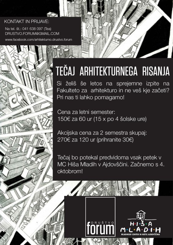 V šolskem letu 2013/2014 bomo ponovno organizirali tečaj arhitekturnega risanja, ki bo namenjen novi generaciji bodočih študentov arhitekture. K vpisu so vabljeni vsi vedoželjni dijaki 3. In 4. letnikov, ki želijo svojo pot izobraževanja nadaljevati na Fakulteti za Arhitekturo. Prijave sprejemamo na društvenem e-mail naslovu drustvo.forum@gmail.com.