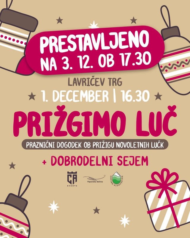 Praznični program s prižigom lučk pripravlja Peter Avbar in bo v slogu prepleta treh generacij prežet z glasbenimi in pevskimi točkami. Zaradi napovedane burje, ki bi utegnila povzročiti nevšečnosti tako nastopajočim kot tudi razstavljalcem na stojnicah, so organizatorji celoten dogodek s prižigom lučk premaknili na torek, 3. decembra, tudi ura je zamaknjena, in sicer na 17.30. Vabljeni, da skupaj razsvetlimo skupnosti. V sklopu veselega decembra bo prazničnih vsebin še več, spremljajte občinske spletne kanale.