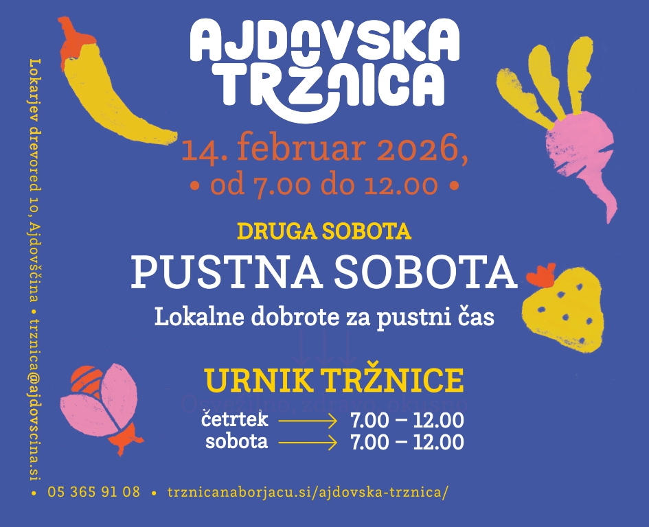 Tradicionalna Druga sobota na Ajdovski tržnici zato vabi, da v soboto, 15. februarja, med 7. in 12. uro na stojnicah poiščete lokalne dobrote za pustni čas. Na Ajdovski tržnici je ob sobotah vedno živahno, tokrat pa bodo k vzdušju prispevale tudi pustne maske, ki bodo zagotovo zašle tudi med stojnice naše mestne tržnice. Svoje nakupovalne vrečke bomo kot običajno lahko napolnili s krompirjem in zelenjavo, s siri in mesninami, z oljem in medom in še marsičem, kar je na tržnici vedno sveže in z znanim poreklom. Če pa se bo v vrečki znašel še kakšen sveže pripravljen krof, toliko bolje, kajne?