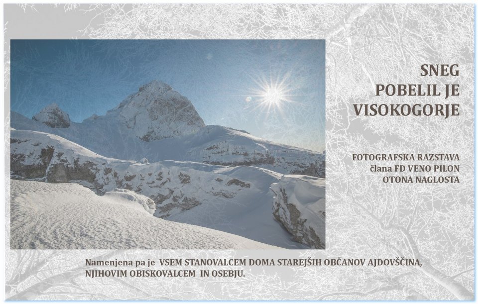 Društvo fotografov Veno Pilon Ajdovščina je tudi v letošnjem decembru v prostorih Doma starejših občanov postavilo razstavo z naslovom Sneg je pobelil visokogorje.