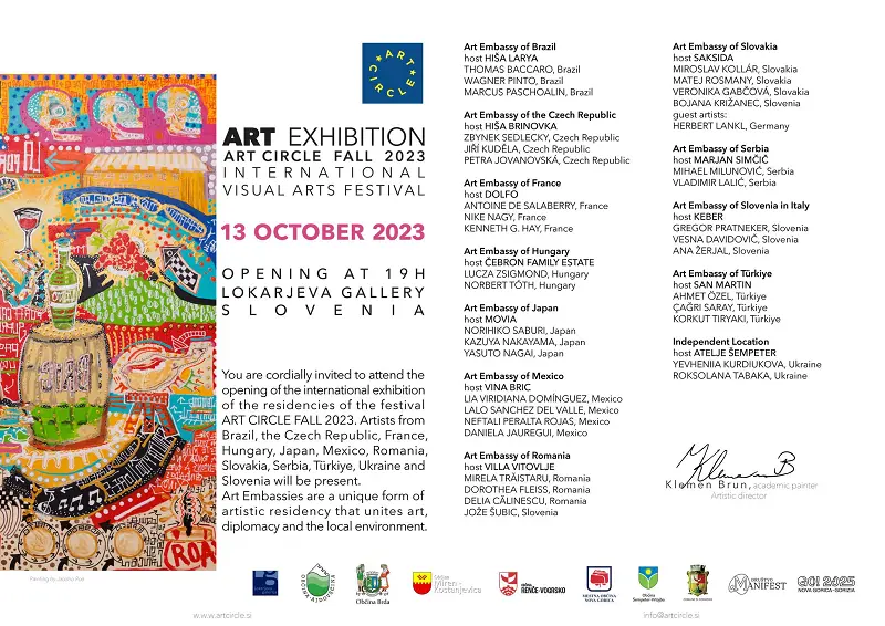Vljudno vabljeni, da se udeležite odprtja mednarodne razstave in zaključka umetniških rezidenc festivala Art Circle jesen 2023, na katerem bodo svoja dela predstavili umetniki iz Brazilije, Češke, Francije, Madžarske, Japonske, Mehike, Romunije, Slovaške, Srbije, Turčije, Ukrajine in Slovenije. Kulturne ambasade so edinstvena oblika umetniške rezidence, ki združujejo umetnost, diplomacijo in lokalno okolje.