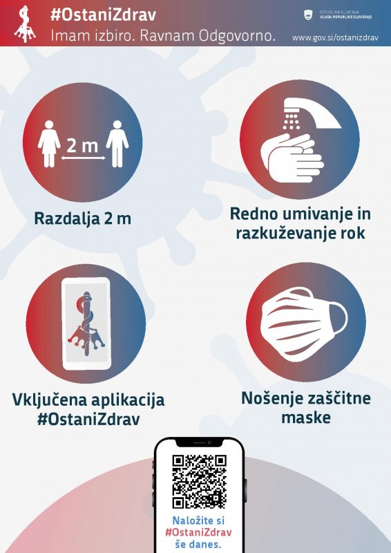 Kljub sproščanju ukrepov, ki nam bodo nekoliko olajšali življenje, se epidemija še ne umirja. Odgovornost je torej na nas samih. Ravnajmo preudarno in se obnašajmo varno. Ukrepi delujejo le, če jih dosledno spoštujemo. Nošenje zaščitne maske, razkuževanje rok in primerna socialna distanca so enostavna, vendar učinkovita zaščita. Ostanite zdravi!