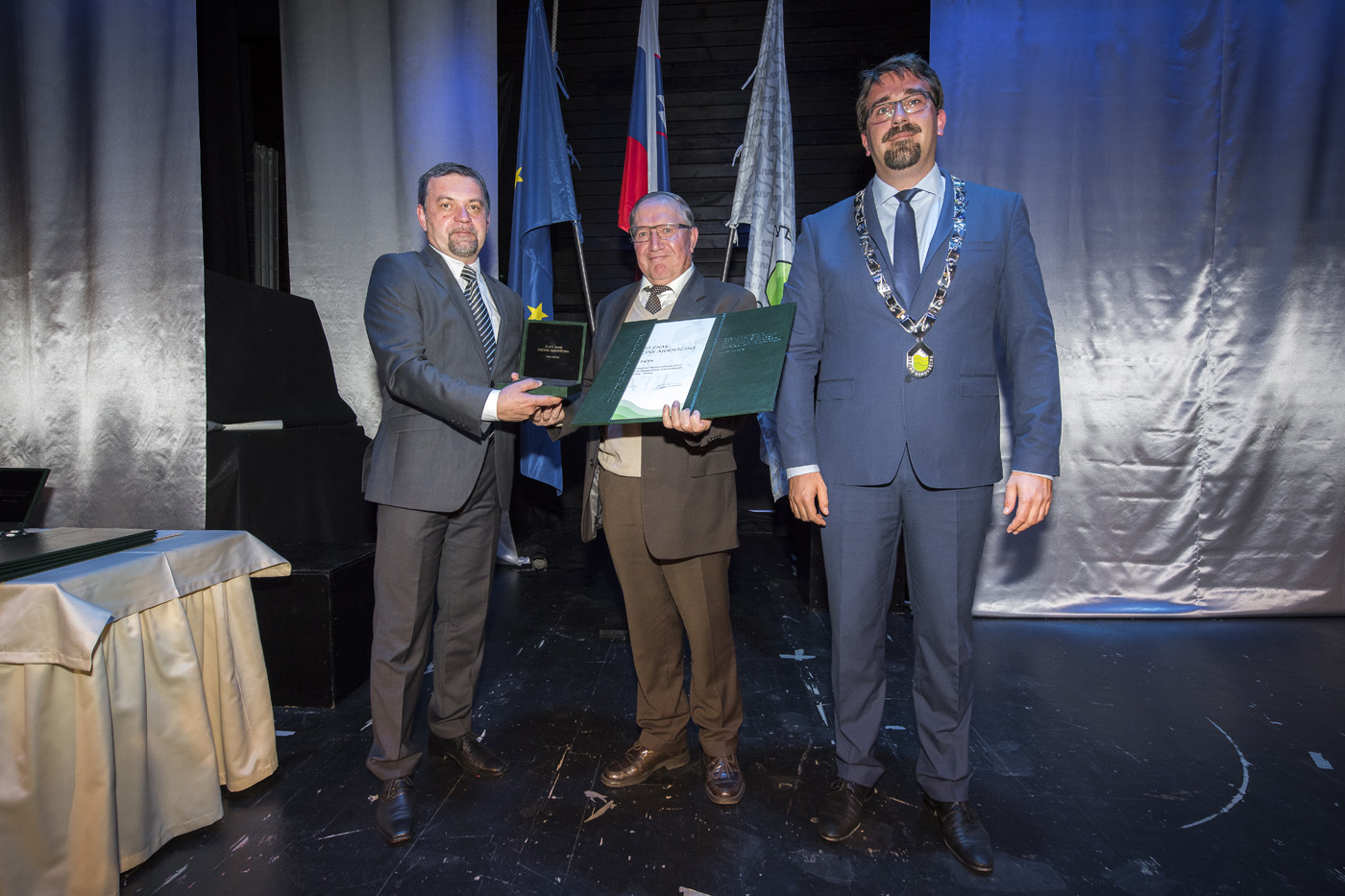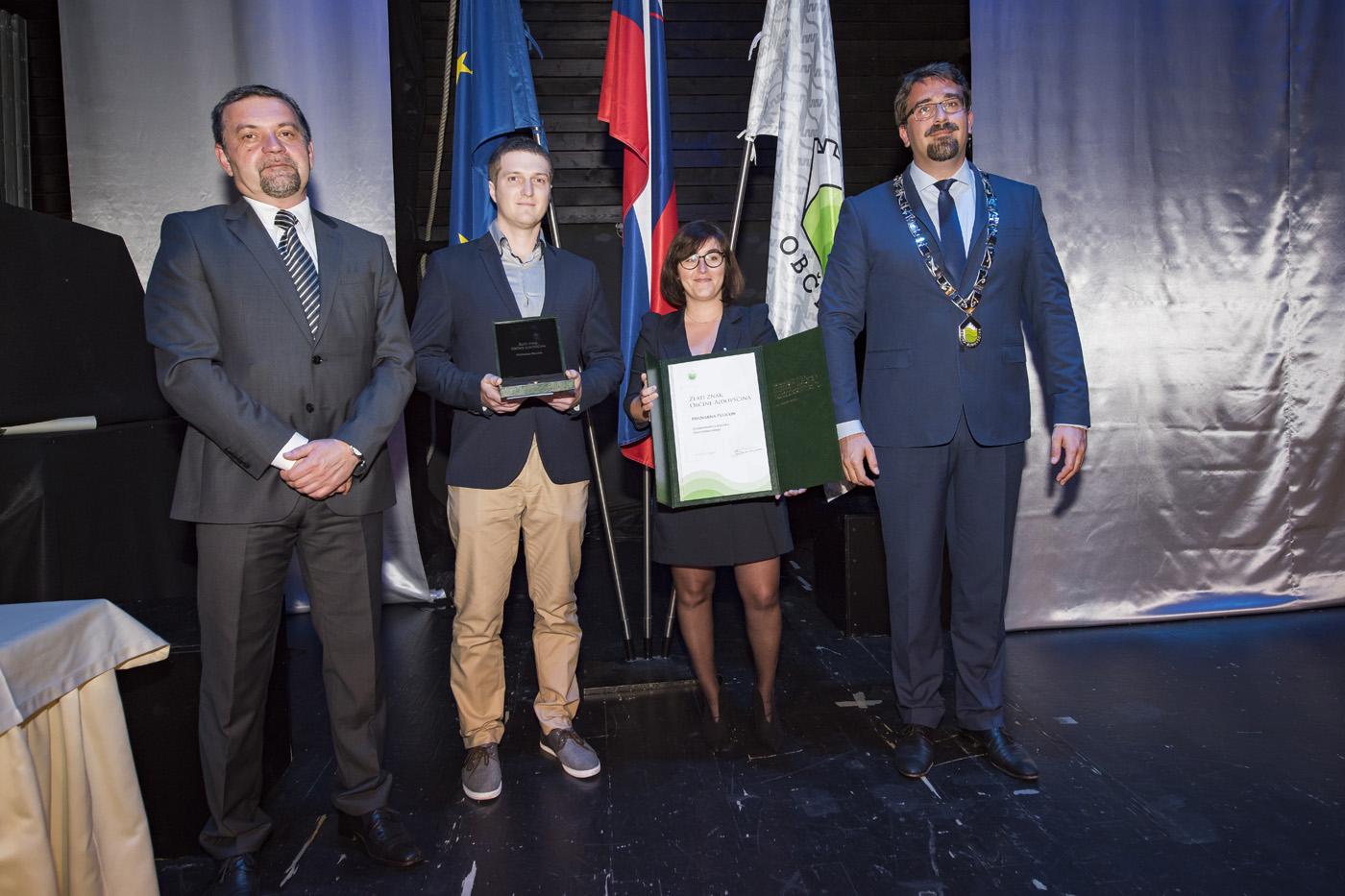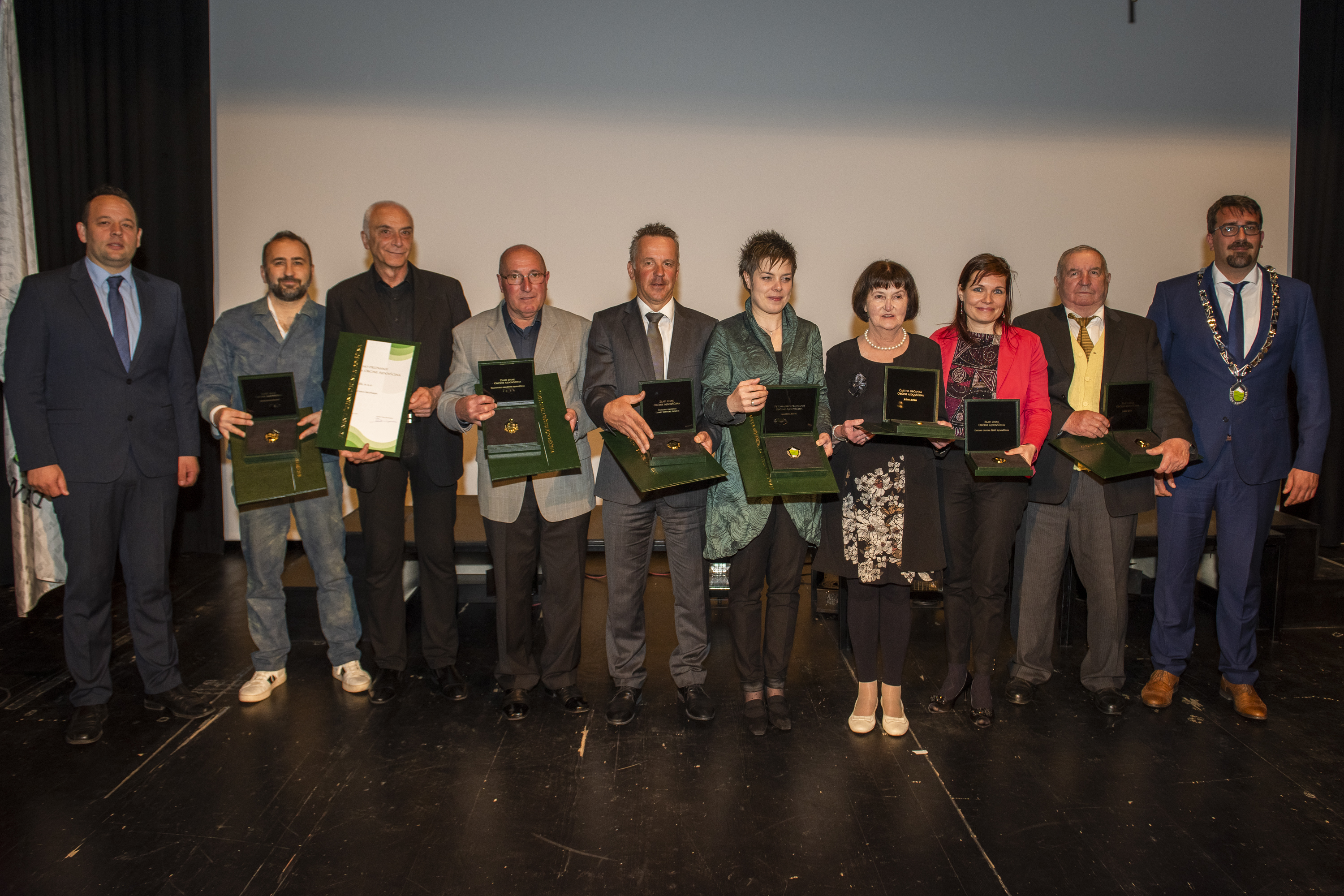 Skupna fotografija nagrajencev z županom Tadejem Beočaninom in predsednikom Komisije za mandatna vprašanja, volitve in imenovanja Jordanom Polancem