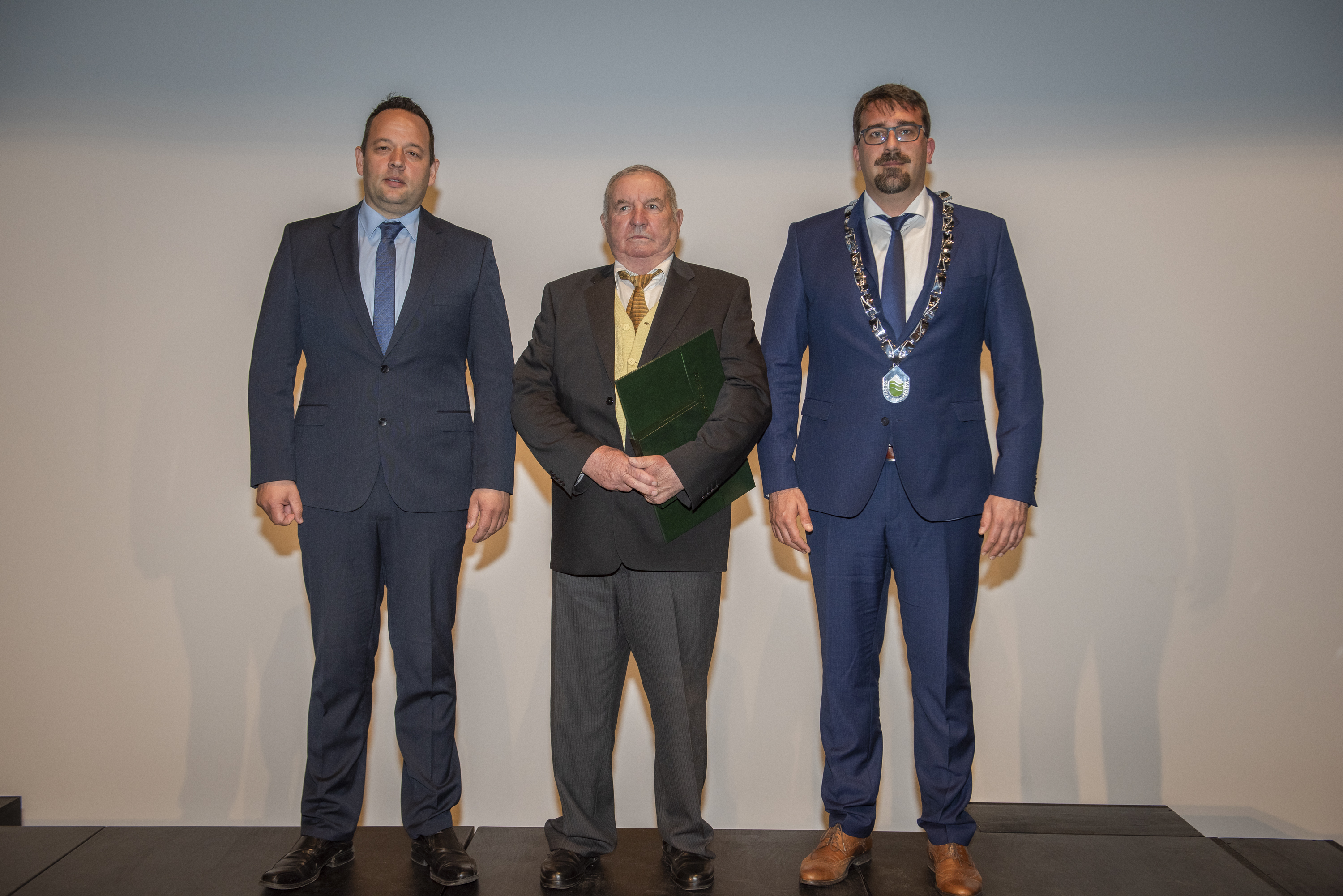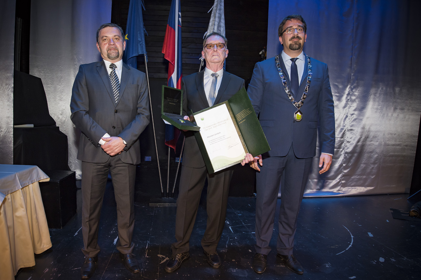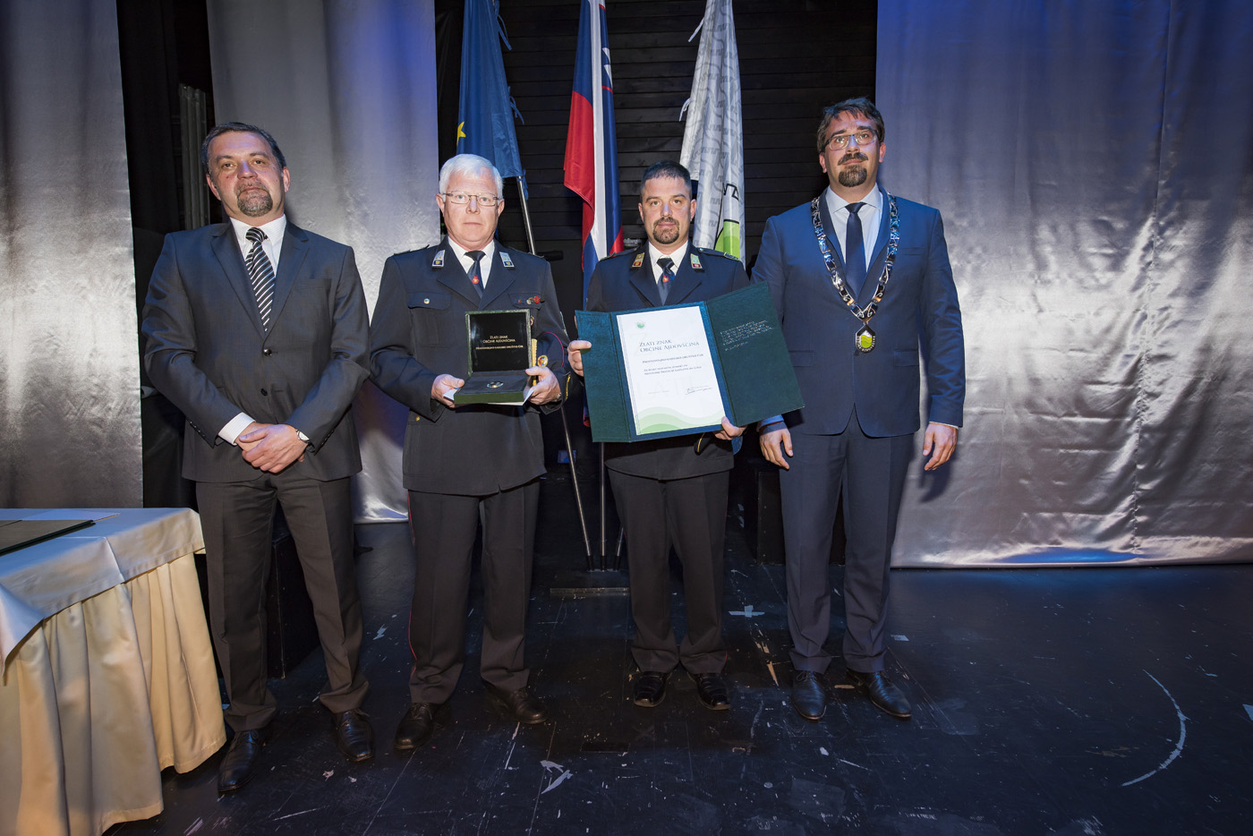 Skupna fotografija nagrajencev z županom Tadejem Beočaninom in predsednikom Komisije za mandatna vprašanja, volitve in imenovanja Jordanom Polancem