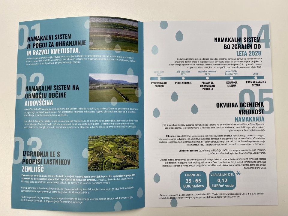 Občina Ajdovščina si z več aktivnostmi prizadeva uresničiti projekt vzpostavitve namakalnega sistema. V teh dneh je za namen boljšega informiranja izšla tudi zgibanka, ki vsebuje vsa pomembna dejstva o postopkih izgradnje enega največjih projektov na našem območju. Prve pogodbe z lastniki večjih zemljišč so že podpisane.