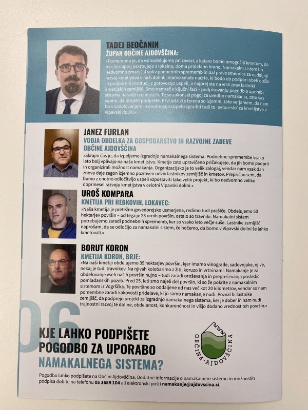Hkrati že dober mesec potekajo tudi pogovori s kmetovalci. Interes je zelo velik, kmetje so naklonjeni projektu izgradnje namakalnega – prve pogodbe z največjimi lastniki so že podpisane. Pogodbo lahko lastniki kmetijskih zemljišč podpišete na Občini Ajdovščina, dodatne informacije so na voljo na telefonski številki 05 36 59 104 ali e-naslovu namakanje@ajdovscina.si.