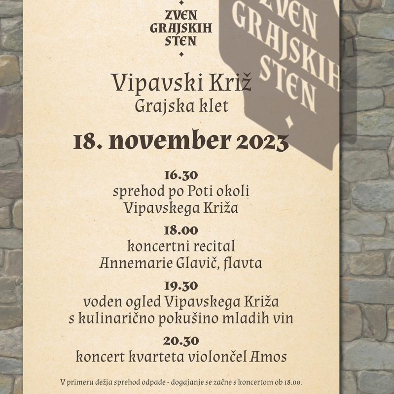 Odlična kulturna ponudba bo jutri tudi v Vipavskem Križu, kamor se vrača koncertni niz Zven grajskih sten v organizaciji Glasbenega društva Nova, tokrat v sodelovanju z Zavodom za turizem Vipavski Križ. Ob pokušini mladih vin bosta tako v soboto v Grajski kleti v Križu potekala kar dva koncerta – ob 18.00 koncertni recital flavtistke Annemarie Glavič, ob 20.30 pa še koncert kvarteta violončel Amos. Pred obema koncertoma bo organiziran tudi voden ogled Vipavskega križa s kulinarično pokušino in mladimi vini. Degustacije vin in lokalnih jedi v soboto zvečer prirejajo tudi v trgovinici Darovi Vipavske.