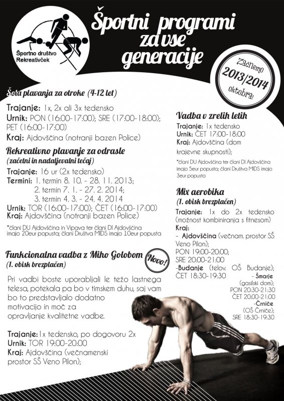 Rekreativček je že dobro poznano ime med otroci in mladimi, navdušenimi nad rekreacijo. Društvo vabi tudi na rekreativno plavanje za odrasle - začetni in nadaljevalni tečaj, za upokojence pa ponuja vadbo v zrelih letih - prvi obisk vadbe je brezplačen.