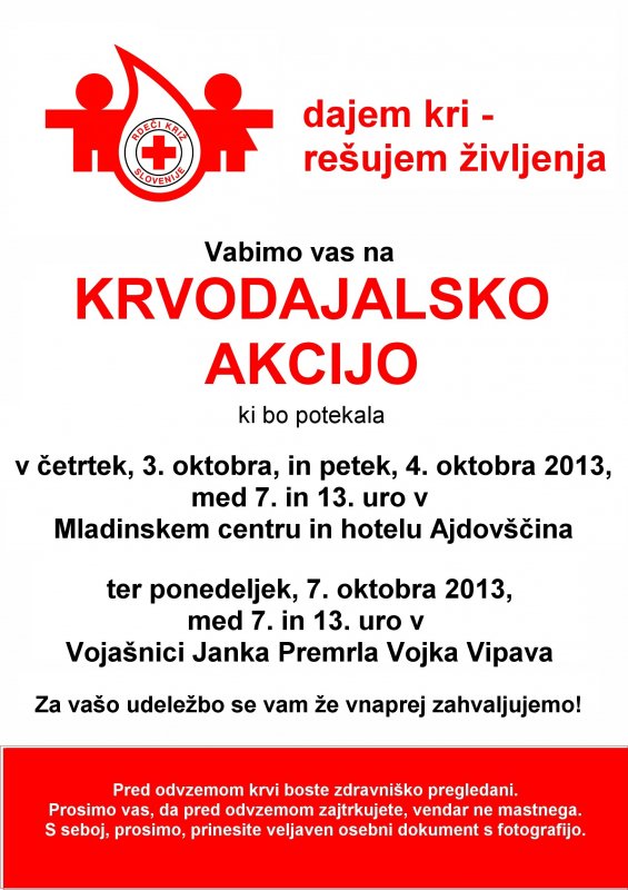 Rdeči križ Ajdovščina vas vabi na krvodajalsko akcijo, ki bo potekala v četrtek in petek, 3. in 4. oktobra, v prostorih Mladinskega centra in hotela Hiša mladih v Ajdovščini.