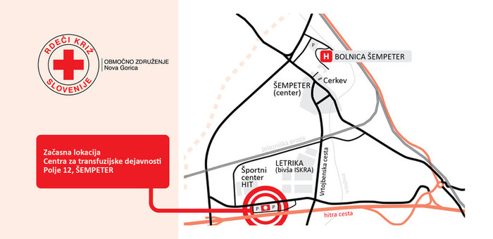 Zaradi prenove transfuzijskega oddelka v šempetersi bolnišnici, je sedaj kri mogoče darovati na novi začasni lokaciji, in sicer v bivši stavbi ICIT, Polje 12 Šempeter, nasproti podjetja Letrika. Natančno lokacijo si lahko ogledate na priloženi sliki.